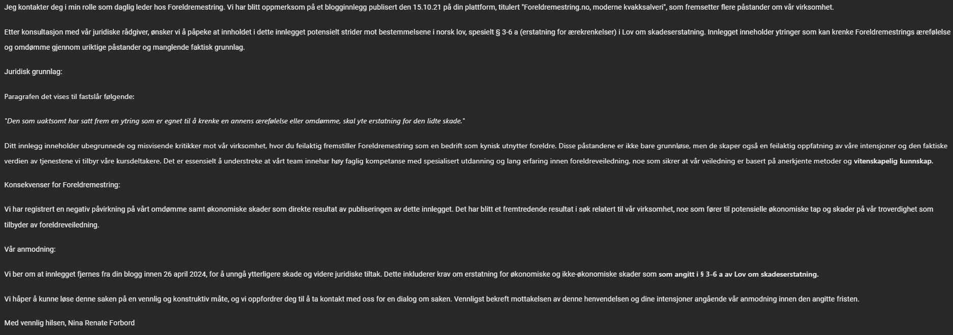 Det er tydelig et økende problem. Firmaer tåler ikke en offentlig debatt rundt sitt tjenestetilbud og truer med represalier om kritikk ikke fjernes. Det de glemmer er at alle har en rett til en offentlig debatt med relevante innspill om selskapet. Selskaper som foreldremestring.no prøver å skape en falsk kundetilfredshet ved å manipulere den offentlige debatten. Vi kjenner spesielt igjen dette fra USA hvor målet er å tømme kritikernes lommebok for å få viljen sin. Dette betegnes som SLAPP saker.
